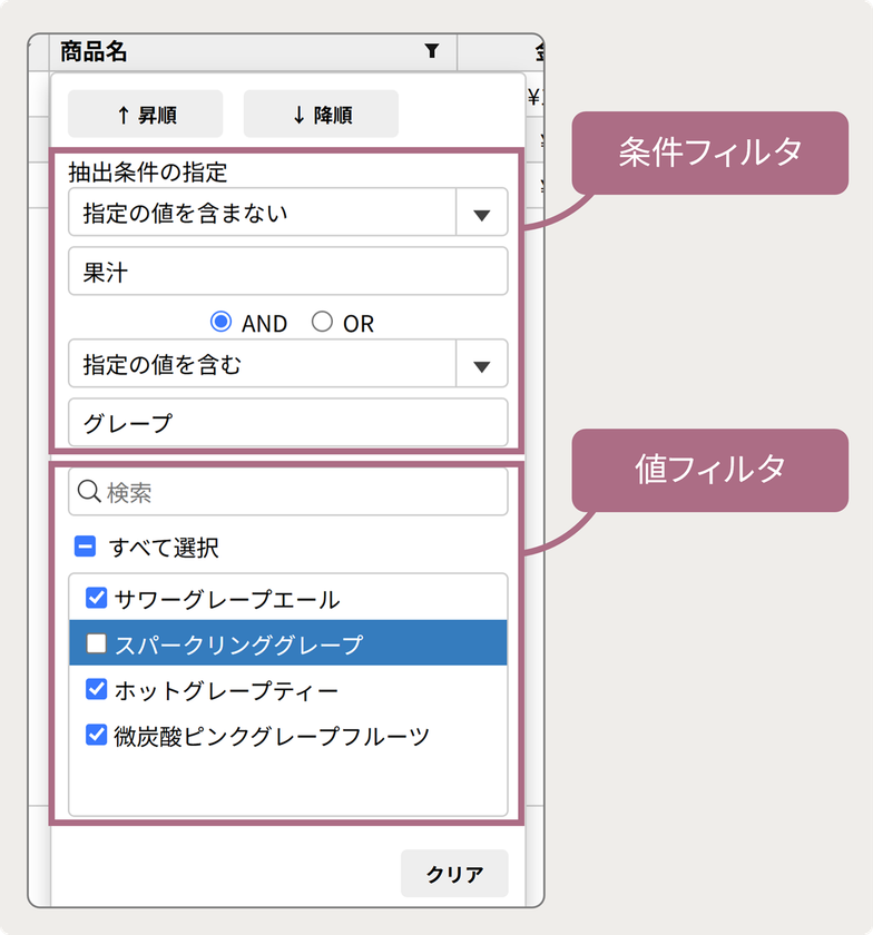 まず、FlexGridにフィルタリング機能を追加する「FlexGridFilter」コンポーネントにおいて、条件フィルタと値フィルタを同時に利用できるマルチフィルタ機能を新たにサポートしました。条件フィルタは「指定の値を含まない」などの抽出条件を設定して特定の語句を検索できる機能で、値フィルタはグリッド内の値から該当する項目をフィルタできる機能です。これにより、複雑な条件での検索や、フィルタ項目が多いケースでも柔軟な絞り込みが可能になりました。