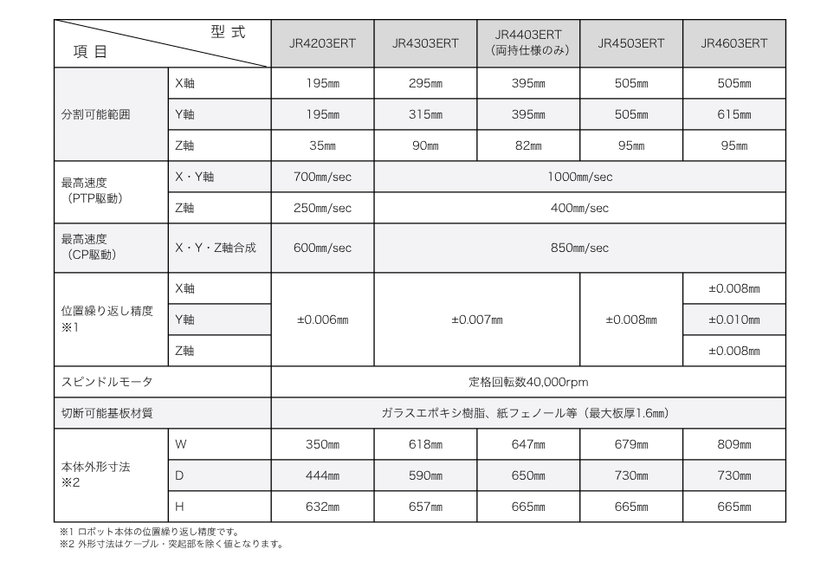 JR4000シリーズ 基板分割ロボット 主な仕様