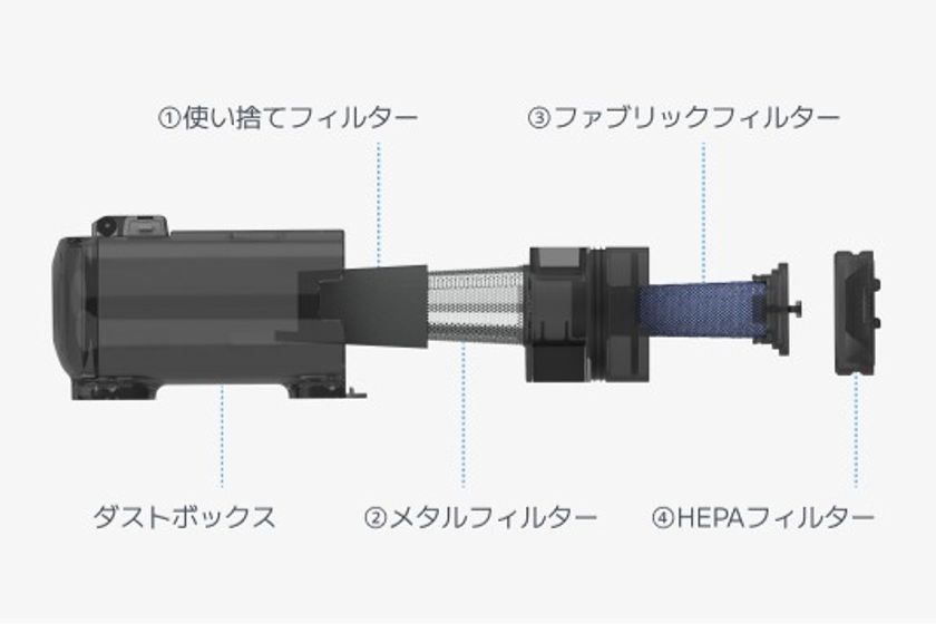 0.3umの超微細なホコリも99.9%集塵するHEPAフィルターなど4重フィルター構造でゴミをキャッチ。吸引力を維持しながら排気もクリーンに。