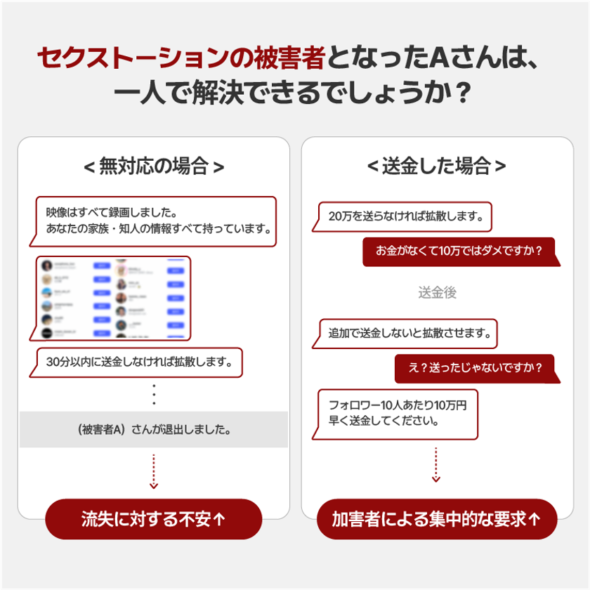 *セクストーションとは、SNSやチャットを通じて入手した性的な画像や動画を悪用し、金銭や追加の映像を脅し取る行為です。