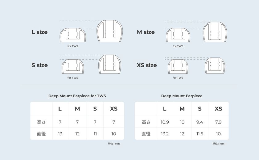 イヤーピースサイズ(外径):L 約13mm/M 約12mm/S 約11mm/XS 約10mm