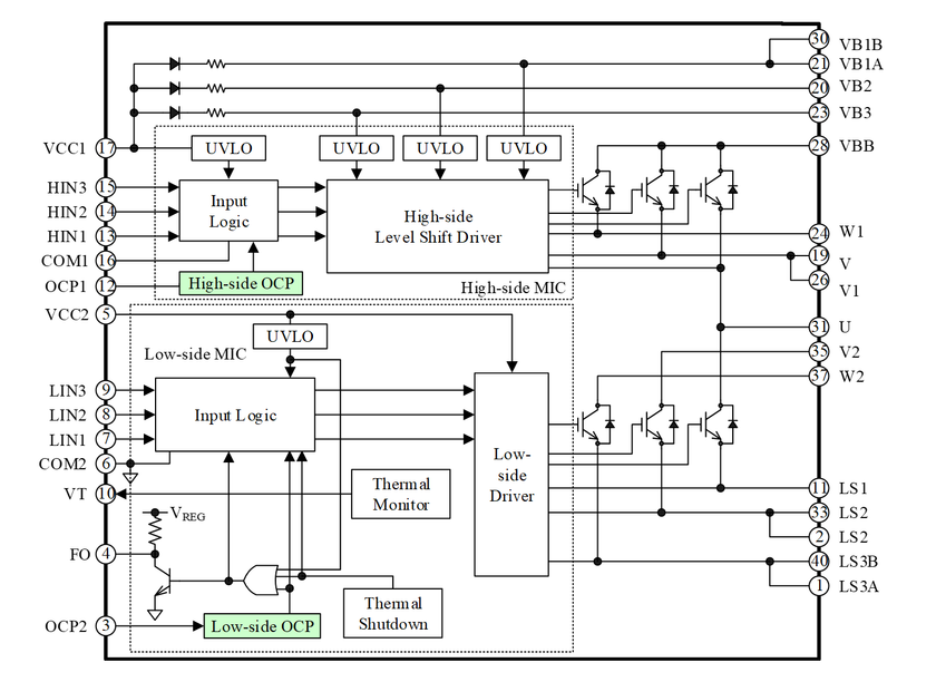 SIM1シリーズは、ハイサイド過電流保護機能(OCP1)とローサイド過電流保護機能(OCP2)を搭載しています。