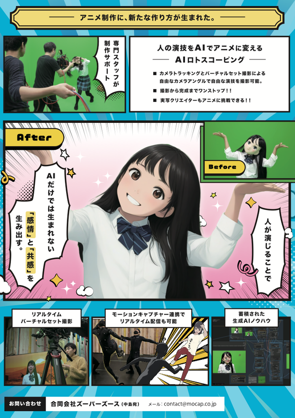 本スタジオは、効率化のためだけでなく、人間が土台となる演技をすることでAIアニメーション表現に新たな“感情”と“共感”を創造するために誕生しました。