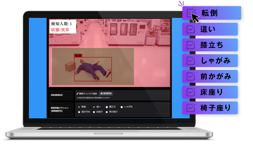 検知したい対象の行動は、設定画面のチェックボックス操作で簡単にオン/オフの設定ができます。直感的なインターフェースはわかりやすく、操作も簡単です。現場に合わせたカスタマイズが、専用の知識不要で可能になります。