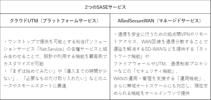 当社では、お客様のニーズに応じて、今回の福井教育委員会様に導入いただいクラウドUTMを含む「2つのSASEサービス」をご提供しています。
