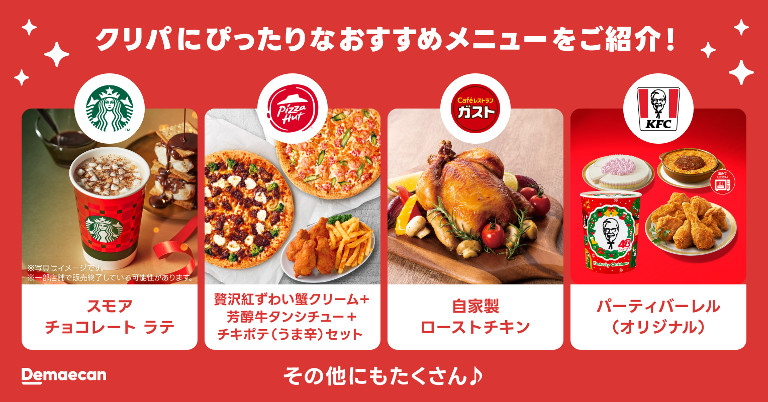特集ページでは、出前館でご注文いただける加盟店のクリスマスにぴったりなメニューをご紹介しております。スターバックスの『スモア チョコレート ラテ』や、ピザハットの『紅ずわい蟹と牛タンシチューの贅沢パーティーセット』、ガストの『自家製ローストチキン』、ケンタッキーの『クリスマスパック S』など、パーティーにピッタリなメニューが多数。大切なパートナーとのひとときや、気のおけない友人との集まり、あるいは自分へのご褒美など、さまざまなシーンでお楽しみいただけるラインナップです。