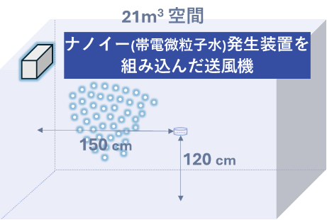 ・ 検証方法:21㎥の試験空間にて、検証装置から1.5m、床面から1.2mの位置にアフラトキシンB1を滴下したシャーレを設置し、ナノイー(帯電微粒子水)を照射(壁面に設置した送風機からの風に乗せて空間内に拡散)