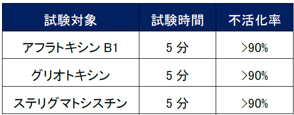 ナノイー(帯電微粒子水)技術により、代表的なマイコトキシン3種に対して90%以上の不活化効果を確認※7,8(検証2)