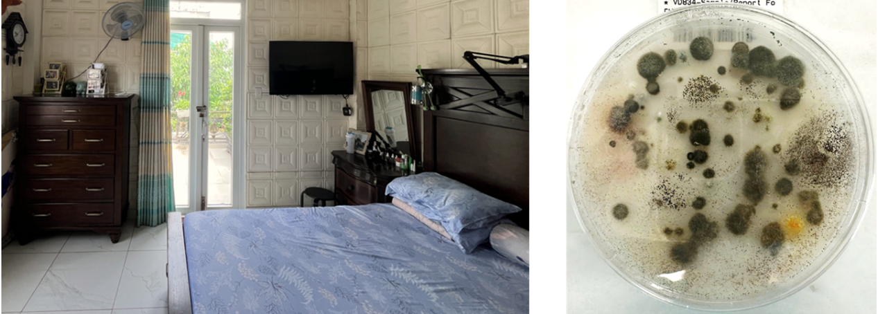 高温多湿な環境にあるベトナムの一般家庭の生活空間の空気サンプルを採取・培養した結果、すべての家庭からカビが検出。その中にマイコトキシンを発生させる可能性のあるカビ属を確認(検証1)