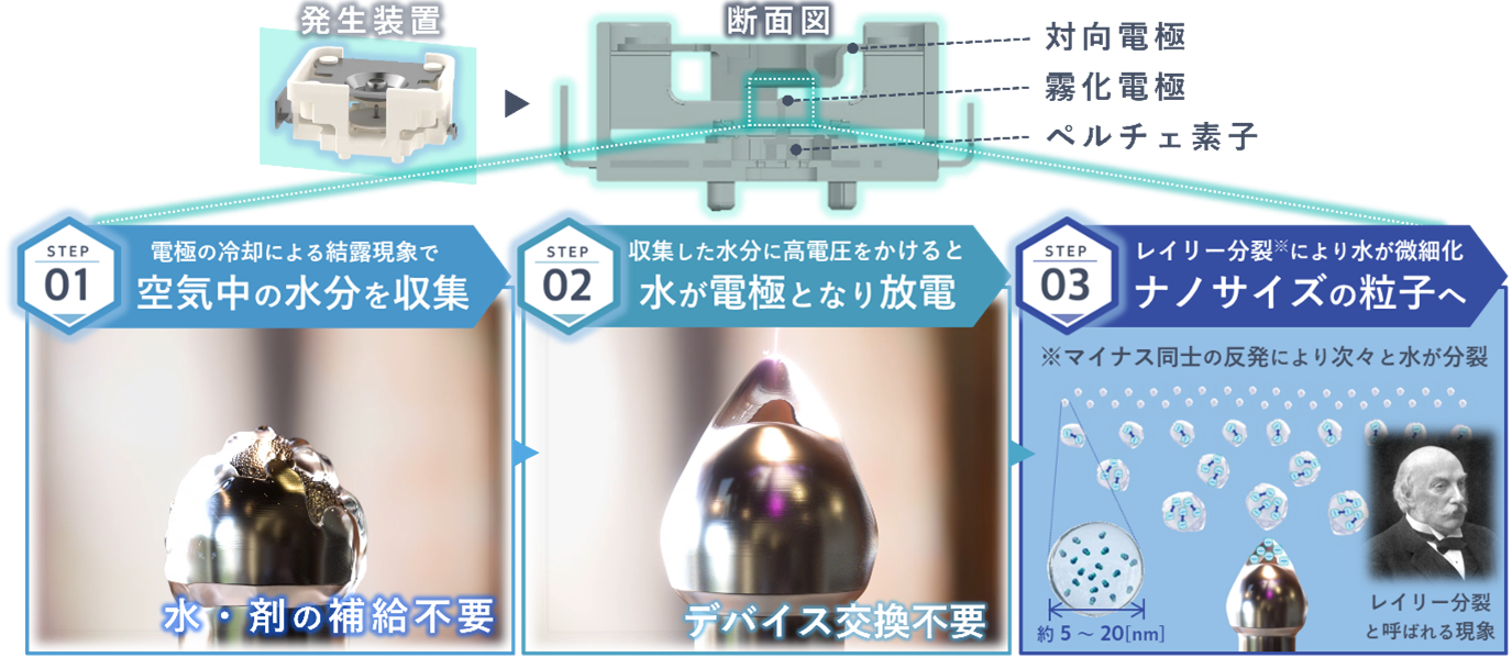 霧化電極をペルチェ素子で冷却し、空気中の水分を結露させて水をつくり、霧化電極と向き合う対向電極の間に高電圧を印加することで、OHラジカルを含んだ、約5~20nmの大きさのナノイー(帯電微粒子水)が発生(図4)