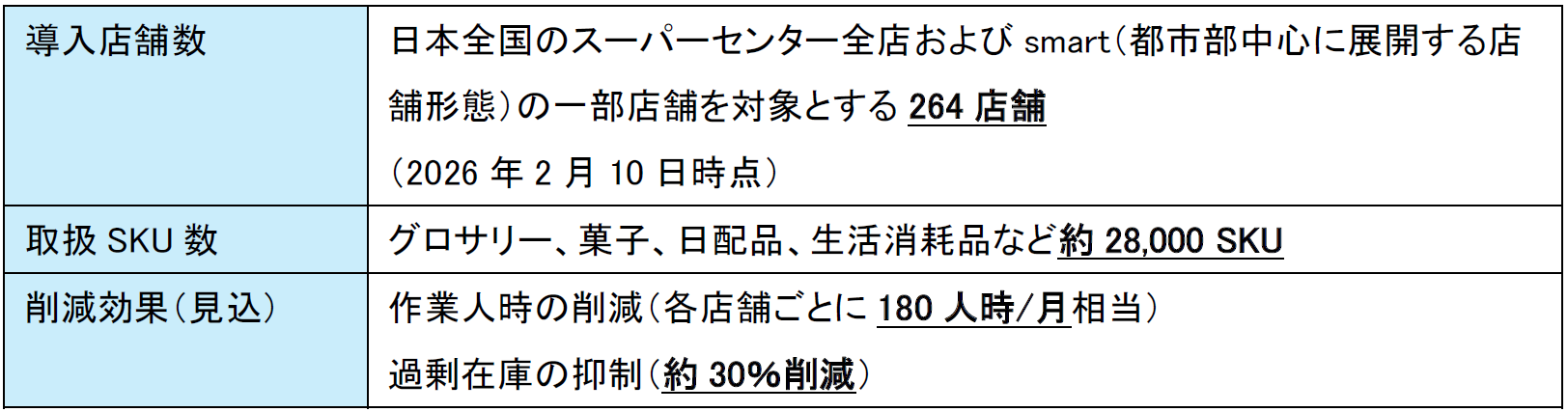 こうした課題に対し、AI-CIXのもつAI・デジタルツイン技術とRetail AIのもつ流通小売向けDXソリューションノウハウをもとにRetail-CIXが開発した「CIX-自動発注」を、トライアルカンパニーの一部店舗において実証を行い、店舗における効率的なオペレーションの効果を確認。その成果をもとに全店舗への本格展開を決定。2025年9月より順次導入を進め、このたびトライアルカンパニーのスーパーセンターを中心とする264店舗への導入が完了いたしました。