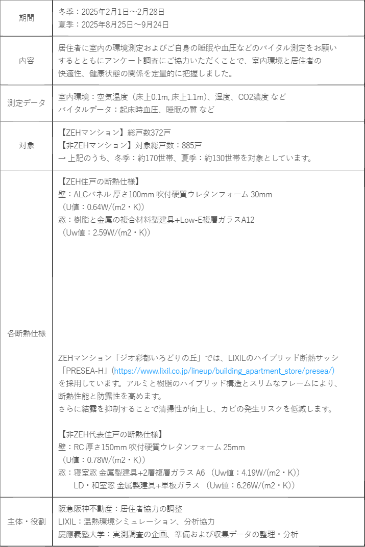 阪急阪神不動産株式会社(本社:大阪府大阪市北区、代表取締役 社長執行役員 福井康樹(以下「阪急阪神不動産」))、株式会社LIXIL(本社:東京都品川区 取締役 代表執行役社長 兼 CEO 瀬戸欣哉(以下「LIXIL」))および慶應義塾大学(所在地:東京都港区、塾長 伊藤公平(以下「慶應義塾大学」))は、このたびZEHマンションにおける、室内環境・居住者の快適性・健康を検証する、産学共同プロジェクトを開始し、170世帯以上を対象とした国内最大級※の冬季・夏季の実証を実施したことをお知らせします。
