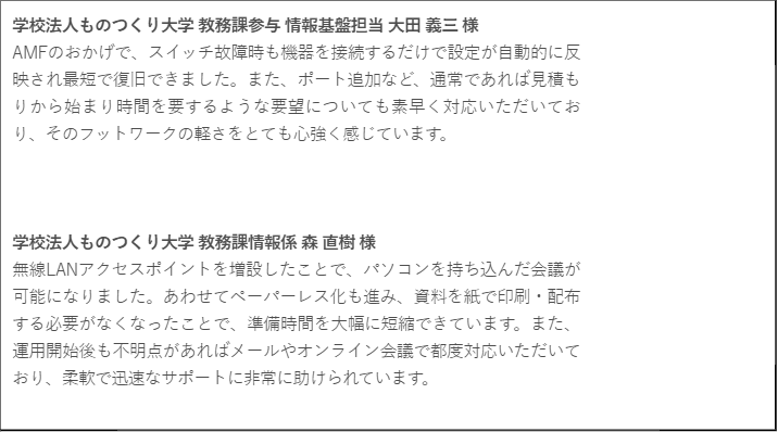 アライドテレシス株式会社(本社 東京都品川区、代表取締役社長 サチエ オオシマ)は、学校法人ものつくり大学(所在地 埼玉県行田市、会長 正井 健太郎、理事長 土屋 喜久)において、当社の製品・サービスが採用されたことを発表いたします。
