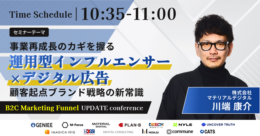 デジタルマーケティング全般のコンサルティング支援を提供する株式会社マテリアルデジタル(本社:東京都港区、代表取締役社長:青崎 曹※、以下「マテリアルデジタル」)の取締役 川端が、11月11日(火)に開催するセミナー「B2C Marketing Funnel UPDATE conference~購買ファネルから紐解くCVR改善の新常識~」に登壇いたします。