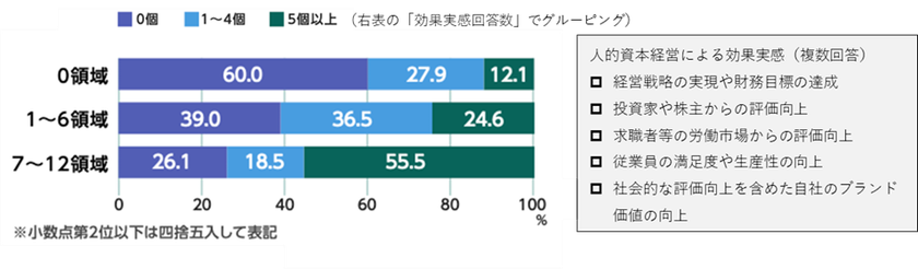 との回答が増加。 ISO 30201を参考に設定した人的資本経営にとって重要な12領域中の7領域以上でデータを活用している企業では、過半数(55.5%)が効果を実感しており、データ活用の進展が人的資本経営の成果向上につながる傾向が見られた。