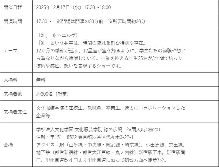 ちふれホールディングス株式会社(本社:埼玉県川越市、代表取締役社長:片岡 方和、以下「当社」)は、学校法人文化学園 文化服装学院(東京都渋谷区、学院長:相原 幸子、以下「文化服装学院」)との共創プロジェクト第3弾として、文化服装学院が2025年12月17日(水)に開催する「卒業制作ファッションショー」にて、「クリスマス×サステナブル」をテーマとした取り組みを実施いたします。