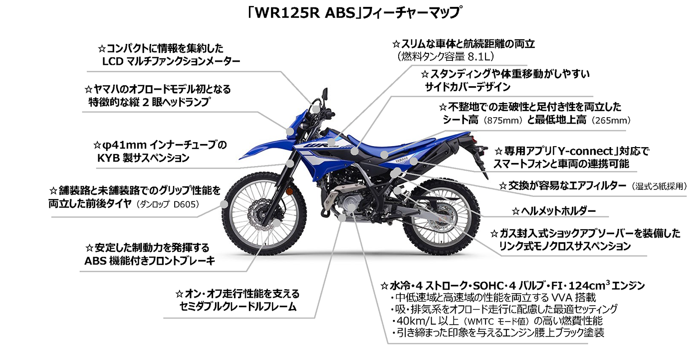 “オフロードの世界に飛び込める青い相棒”をキーワードに、タウンユースやオンロードツーリングでの扱いやすさはもちろん、舗装路からオフロードへシームレスに駆け抜け楽しめる、ファンライド性能を追及したモデルです。主な特徴は、1)日常使いからオフロード走行まで、幅広いフィールドでさまざまな乗り方に呼応する水冷・SOHC・4バルブ・VVA(可変バルブ)・FI・124cm³エンジン、2)フルサイズ(250ccクラス)同等のフロント21インチ・リア18インチホイールやオフロードでの高い走破性を発揮する前後サスペンションなどの足回り、3)自由度の高いライディングポジション、4)ヤマハオフロードモデルらしい特色を備えたデザイン、5)着信通知/燃費管理が可能なスマートフォン専用アプリ「Y-Connect」との連携などです。