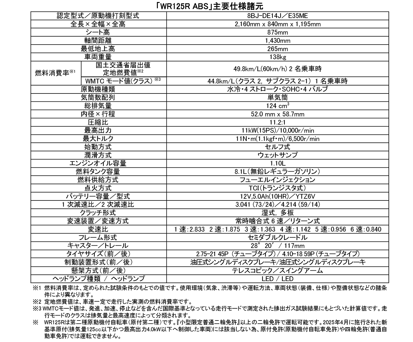 ヤマハ発動機販売株式会社は、幅広い路面状況に適応するマルチポテンシャルを備えたオン・オフモデルの新製品「WR125R ABS」を2026年1月30日に発売します。