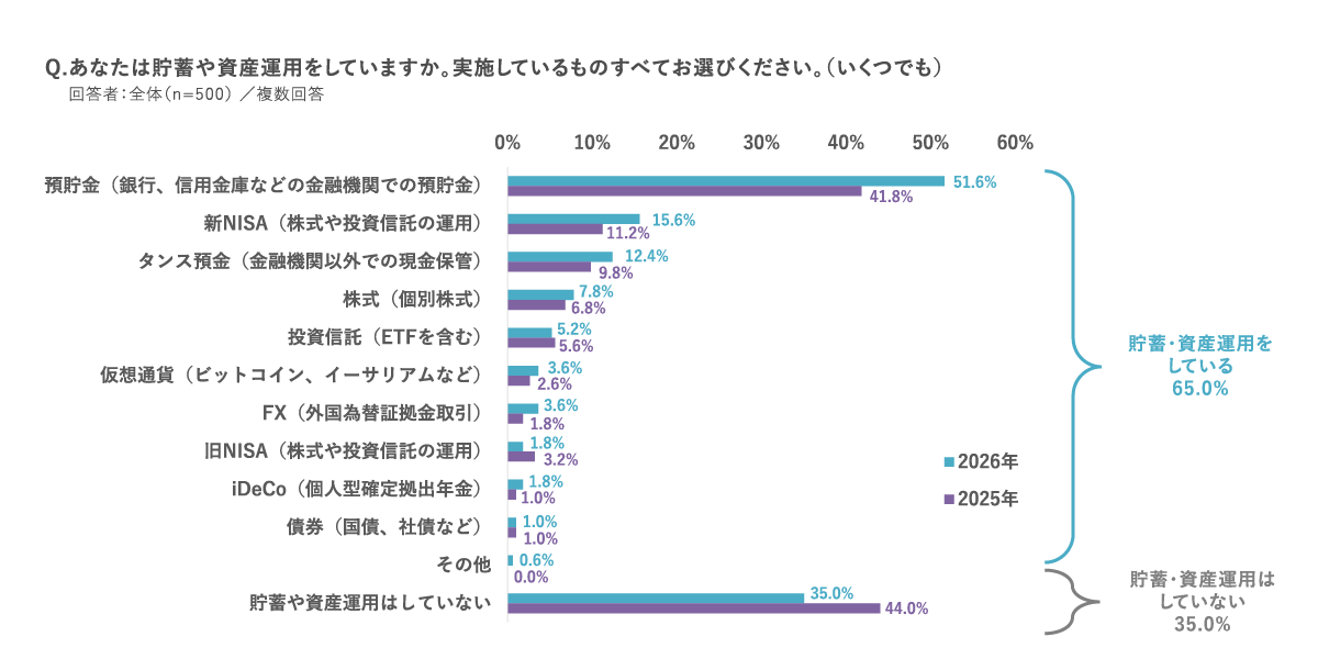 資産運用方法、上位から「預貯金」51.6%、「新NISA」15.6%、「タンス預金」12.4%。
