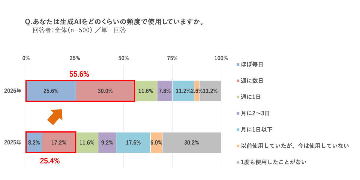 生成AIを「ほぼ毎日」利用する人は25.6%、「週に数日」は30.0%で、いずれも前年から大幅上昇しました。合計すると55.6%に達し、生成AIの活用が加速していることが分かります。
