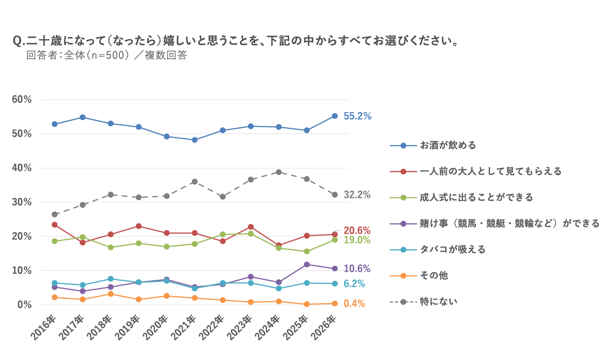 二十歳になって嬉しいこと、1位は「お酒が飲める」55.2%、過去10年で最高