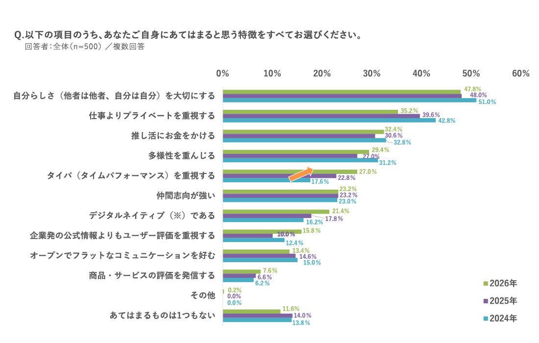 価値観では、昨年に引き続き「自分らしさを大切にする」が47.8%で最多でした。上昇率を見ると、1位は「タイパを重視する」で27.0%(前年比4.2ポイント増)となり、2年で1.5倍になりました。