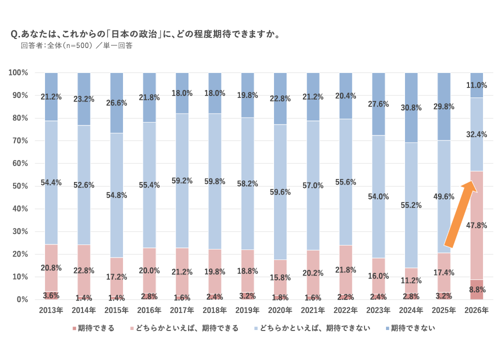 「日本の政治に期待できる」が56.6%で前年の2.7倍、「日本の未来は明るい」も45.2%で1.6倍に