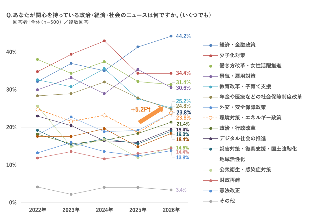 一方、前年からの上昇率で見ると、1位は「環境対策・エネルギー政策」で23.8%(同5.2ポイント増)でした。気候変動や緊迫する国際情勢によるエネルギー価格変動といった外部環境の変化が意識されていると推察されます。