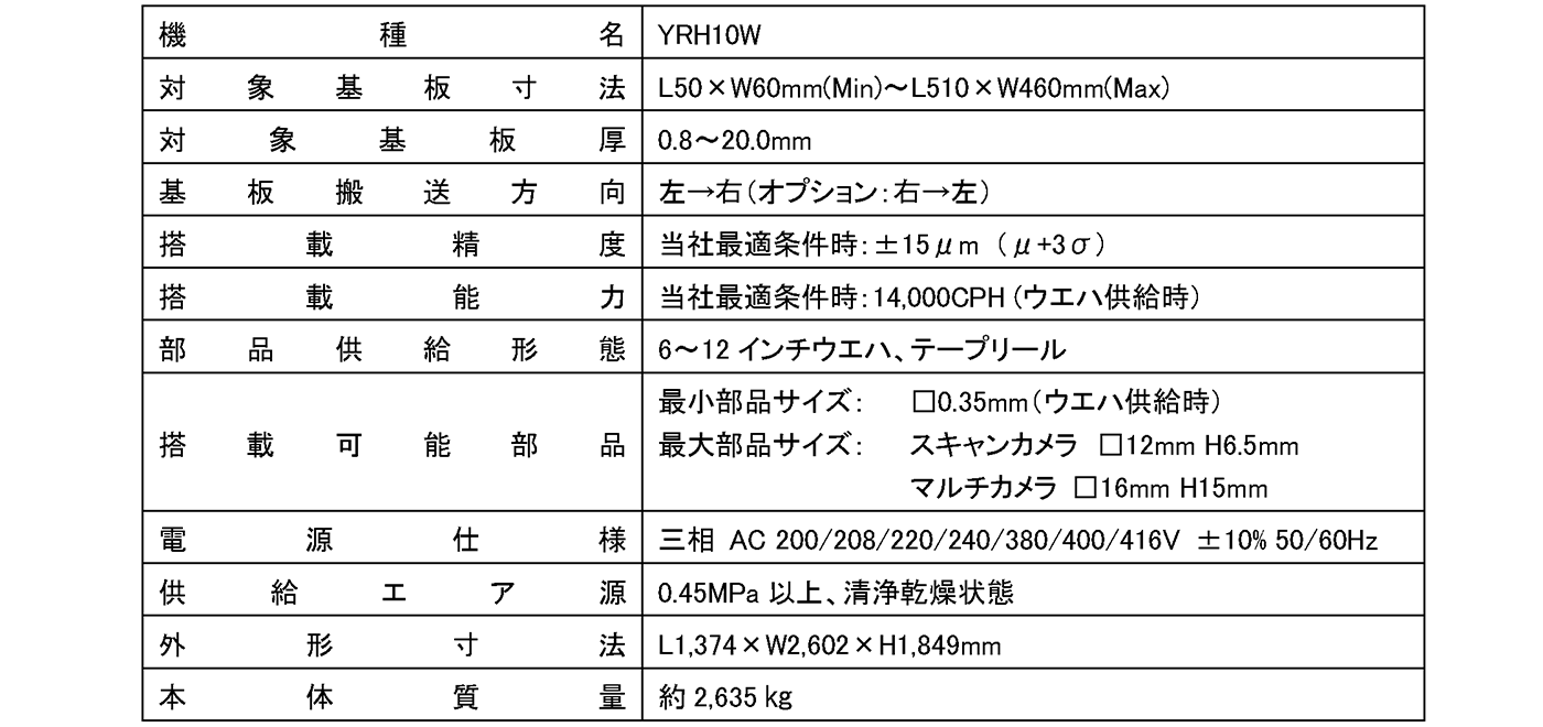 「YRH10W」は、既存モデルのハイブリッドプレーサー「YRH10」をベースに、昨今主流の12インチウエハに対応しつつ、最大L510×W460mmまでの大型基板搬送も可能なワイドモデルです。「YRH10」譲りの高精度搭載と、マウンターシリーズで培ってきた高速搭載の技術を掛け合わせることで、ウエハ供給からのベアチップ搭載速度14,000CPH*³の高速生産性と±15μmの高精度を両立しました。