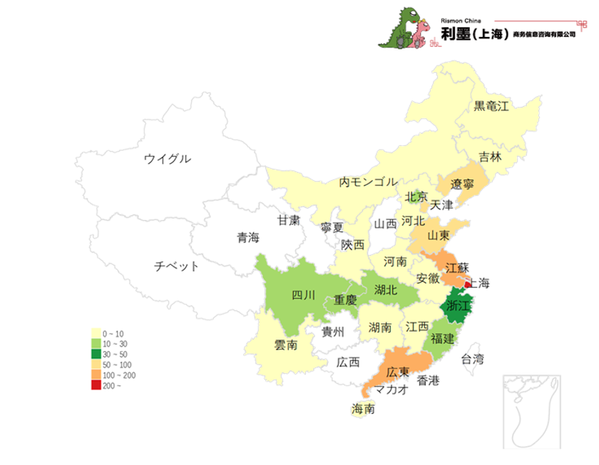 地域別分布では、前回調査と同様に、東部沿岸地域や大型港湾地域に集中する結果となりました。(図2)当該エリアに属する上海や深センなどは対外貿易取扱量が多い国際的な港湾であり、経済特区としての制度優位性もあるため、日系企業が求める安定したビジネス環境に適合しているといえます。