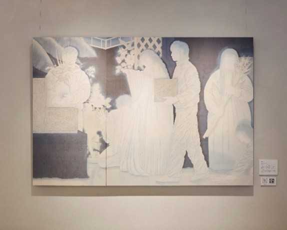 本作は、実在の場所や人物を描いたものではなく、日常生活から得たインスピレーションをもとにイメージを構成した作品です。山﨑氏の関心は一貫して「個と集団」にあり、描かれている人物たちはそれぞれにモノをあるべき場所へと整えています。集団の中における個人の振る舞いが持つ演劇的な側面に着目し、その虚構性からイメージを膨らませています。