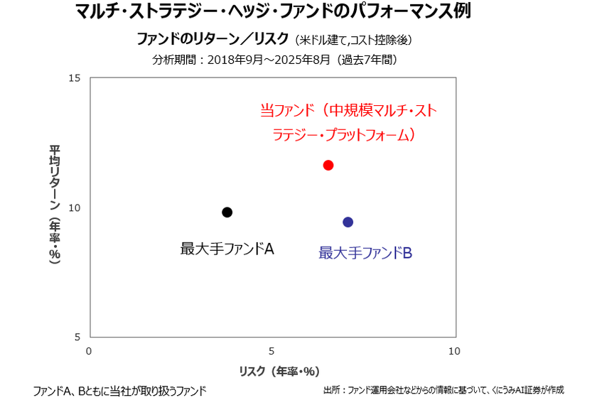 運用資金が集中する最大手ヘッジ・ファンドへの新規投資が困難になる中、くにうみAI証券では、最大手マルチ・ストラテジー・ファンドを追随し得る、中規模のマルチ・ストラテジー・ヘッジ・ファンドを新たに導入し、金融商品のラインナップを拡充しています。