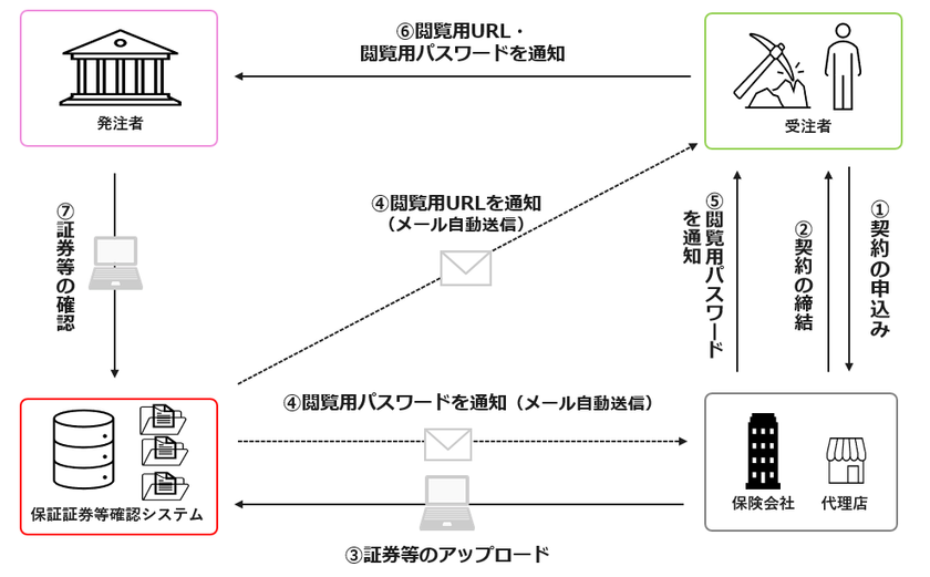 損害保険会社では、証券等を書面で発行する従来の運用に加え、2022年5月からPDFファイルで発行し、電子メールで送付する運用(※1)を行っていました。今般、PDFファイルで発行し、電子メールで送付する運用について、保証証券等確認システムの利用により、損害保険会社(※2)が証券等をWEBプラットフォーム上にアップロードし、受注者(例:建設業者)および発注者(例:国)が同プラットフォーム上で閲覧する運用に変更します(発注者はダウンロードすることも可能)。