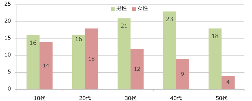15~19歳、20~29歳、30~39歳、40~49歳、50歳~59歳、の年齢5区分ごとに男女各100人。