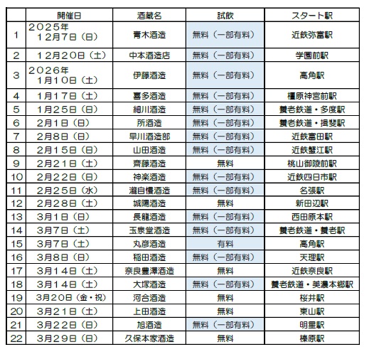 近鉄では、2025年12月7日(日)から2026年3月29日(日)まで、酒蔵を巡るハイキング「酒蔵みてある記」を計22回開催します。