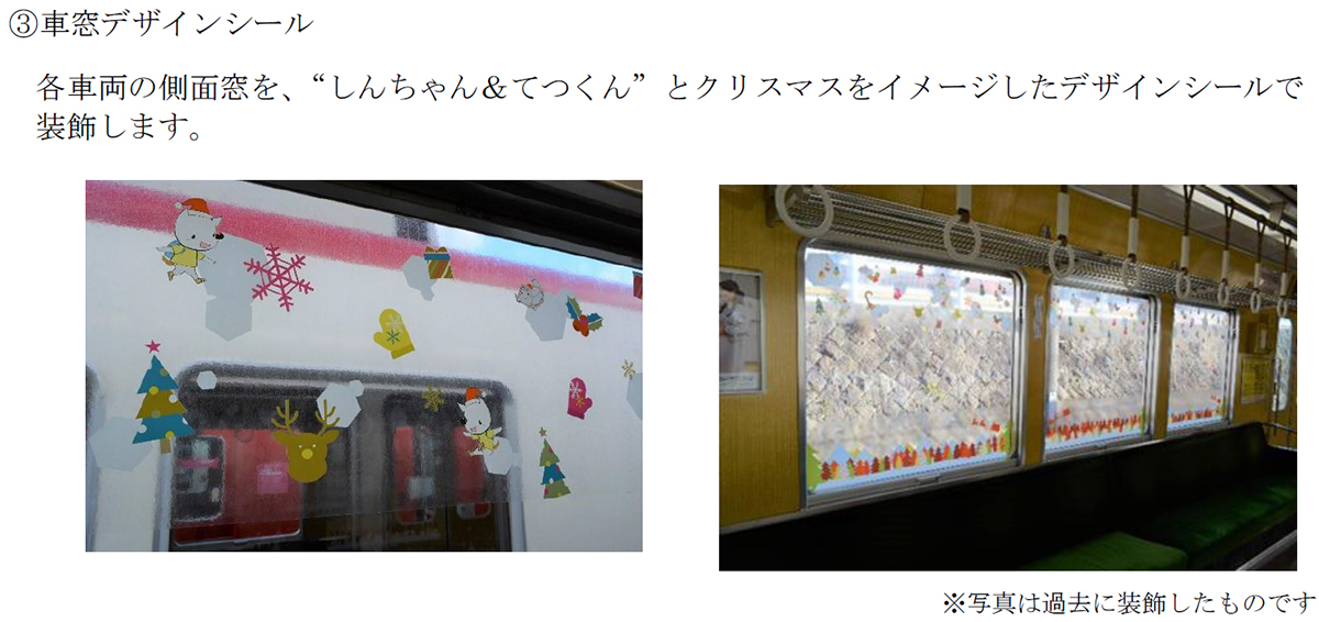 さらに、12月13日(土)には、ご家族連れを対象に、車内で一緒に生演奏でクリスマスソングを歌ったり、“しんちゃん”が、クリスマスプレゼントをお渡ししたりする特別列車「電車に乗ってハッピークリスマス」を運行します。