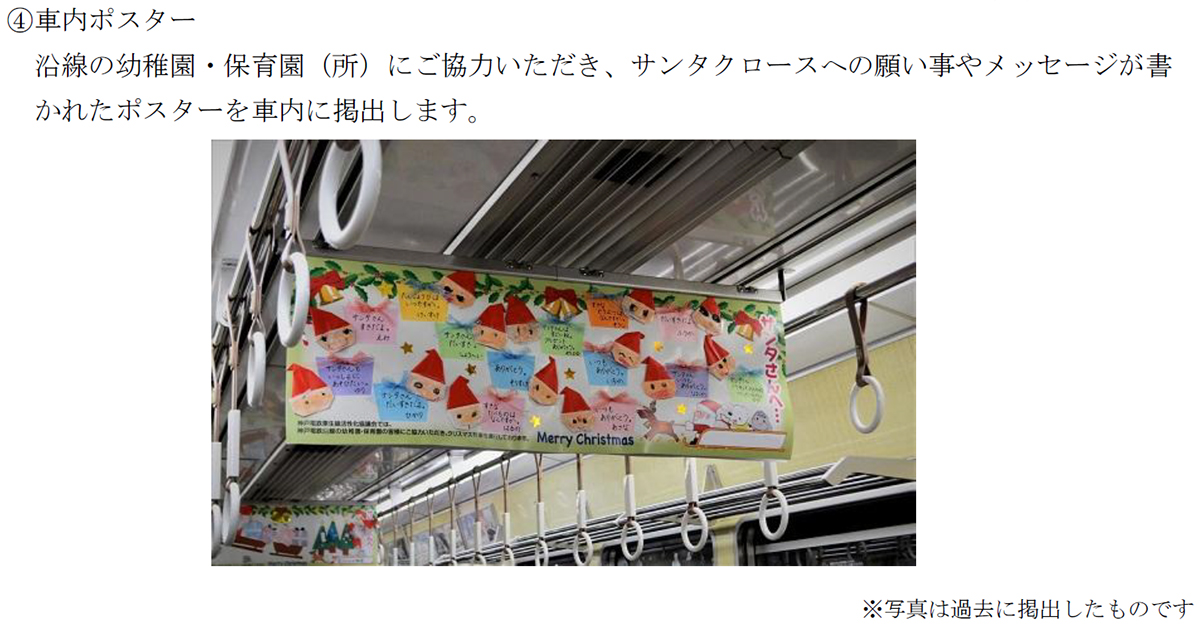 この「クリスマス装飾列車」には、沿線の幼稚園や保育園(所)にご協力いただき、サンタクロースへの願い事やメッセージが書かれたポスターを掲出するほか、神戸電鉄公式キャラクター“しんちゃん&てつくん”をあしらった、デザインシールで車窓を装飾します。