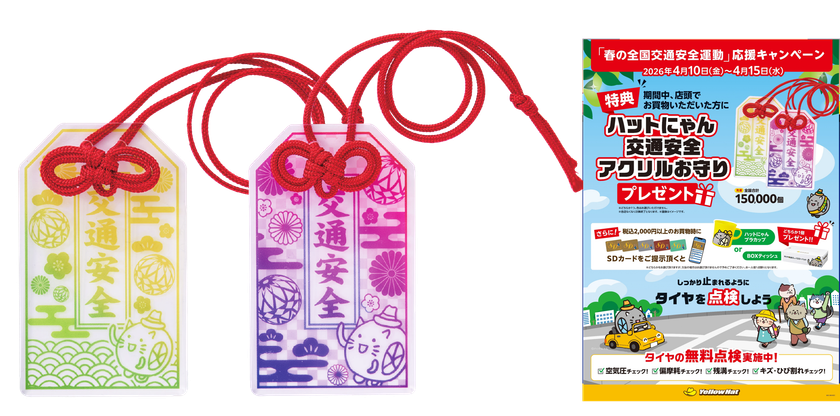 また、イエローハット全店舗において、お買い物いただいた方に「ハットにゃん 交通安全アクリルお守り」をプレゼントする店舗キャンペーンを2026年4月10日(金)から15日(水)まで実施いたします。