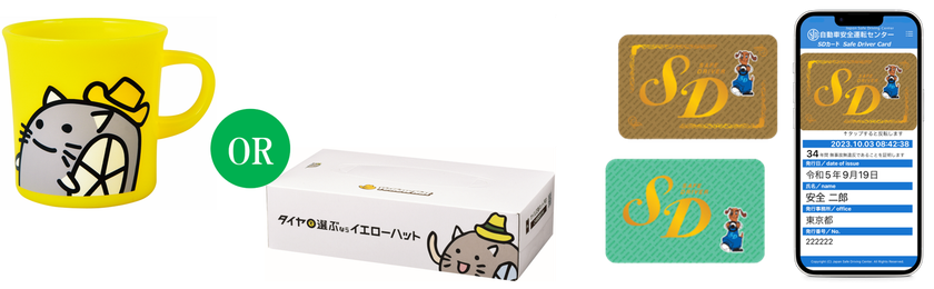 さらに、キャンペーン期間中、店頭で税込2,000円以上のお買物時に「SDカード(Safe Driverカード)」をご提示いただいた方には「ハットにゃんプラカップ」または「BOXティッシュ」をプレゼントいたします。