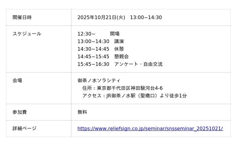 株式会社リリーフサイン(本社:東京都港区、代表取締役:中島 樹里)は、2025年10月21日(火)に、広報・危機管理担当者向けの無料セミナー「炎上しない企業の思考法~ソーシャルリスクと未来戦略~」を御茶ノ水ソラシティで開催します。