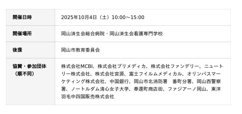 2025年10月4日(土)、岡山済生会総合病院(岡山市北区国体町)は医療や福祉、健康について楽しく学べる病院開放型イベント「済生会フェア」を開催します。