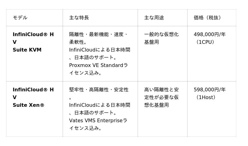 InfiniCloud(R) HV Suite」は、ハイパーバイザーである InfiniCloud(R) HV に加え、対応する人気の仮想化オーケストレーションソフトウェア製品「Proxmox VE」と「Vates VMS」のいずれかをセットにし、日本語サポートを加えて販売するものです。