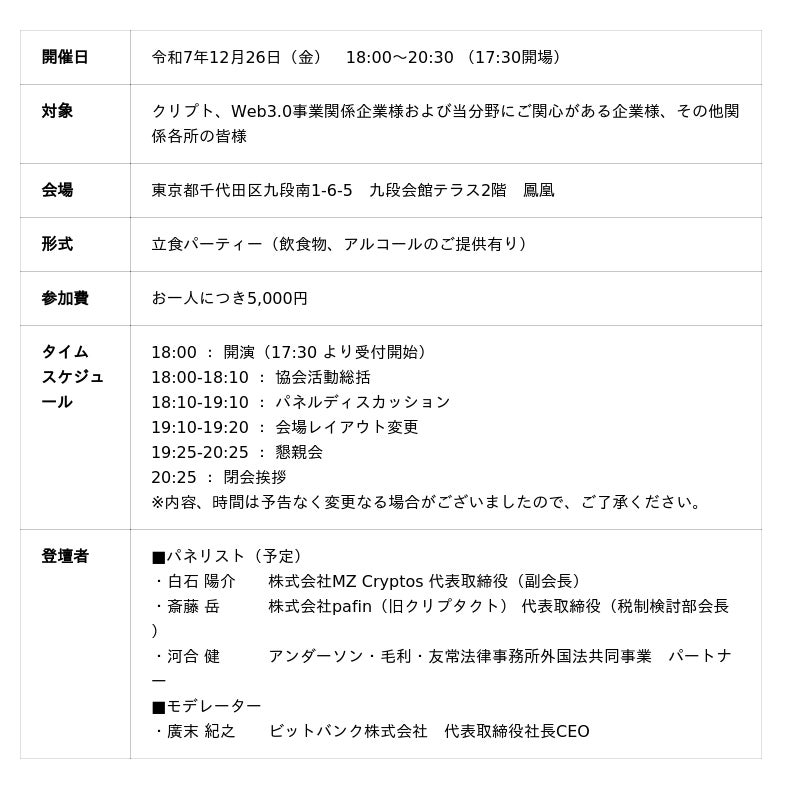 最新の金商法移行に関連する規制動向や、税制、国内ETFなど、今年も激動の中にあった暗号資産業界の注目トピックを中心にパネルディスカッションを行い、その後懇親会を実施いたします。
