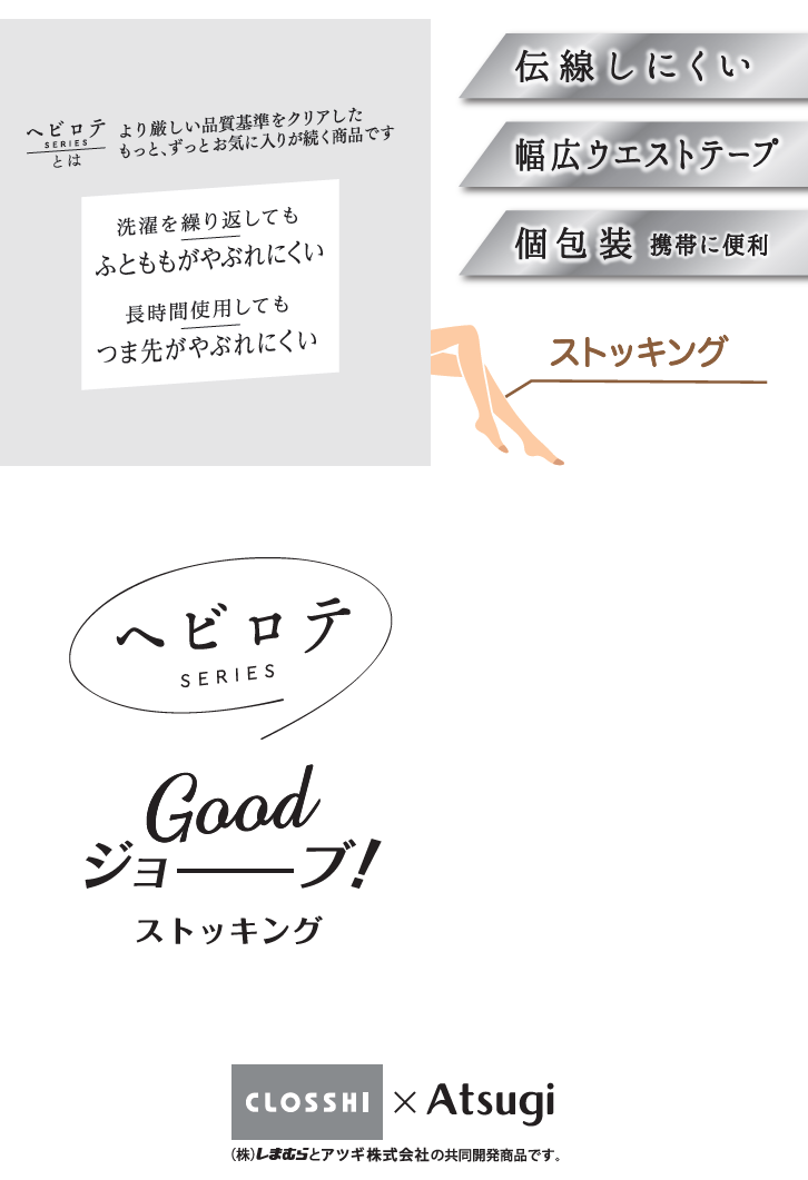 ストッキングのお悩みとなる部分を改良し、繰り返し使っていただけるように『Goodジョーブ!』なストッキングを開発しました。