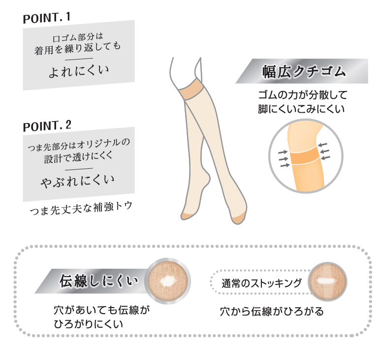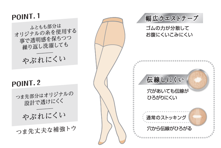 ふともも部分はオリジナルの糸を使用する事で透明感を保ちつつ、繰り返し洗濯してもやぶれにくくなっています。また、つま先部分はオリジナルの設計で透けにくく、長時間使用してもやぶれにくい仕様となっています。その他にも「抗菌防臭」「消臭」「静電防止」機能が備わっています。