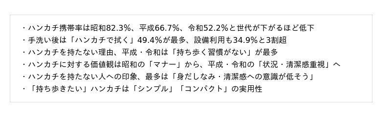今回の調査で、かつては必需品であった「ハンカチ」の存在意義が、世代間で大きく変容している実態が浮き彫りになりました。