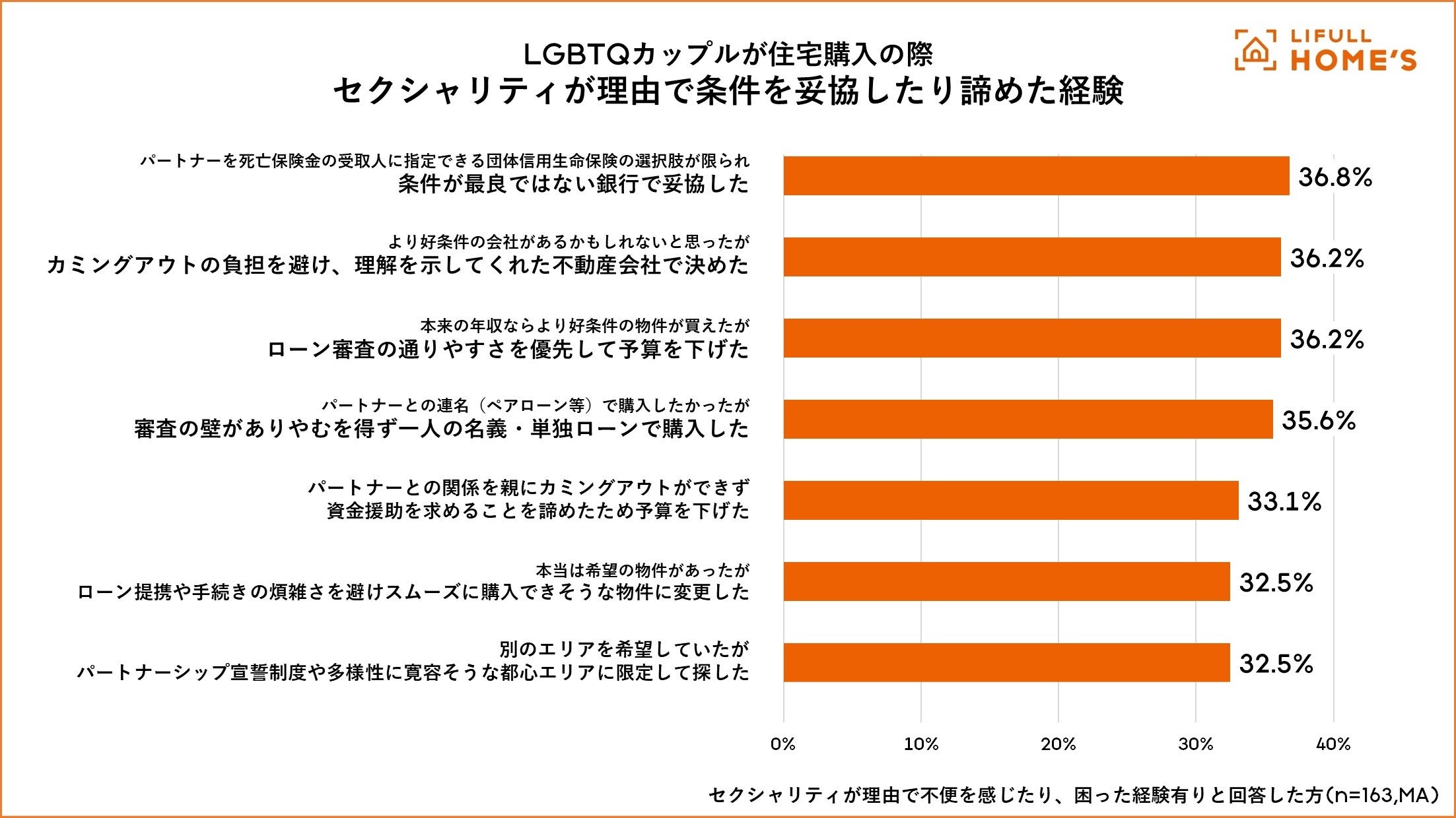 LGBTQカップルで住宅購入時に困った経験がある方に住宅購入の際に、セクシャリティが理由で条件を妥協、諦めた経験について聞いたところ、最も多い回答は「パートナーを死亡保険金の受取人に指定できる団体信用生命保険の選択肢が限られ、条件が最良ではない銀行で妥協した(36.8%)」でした。