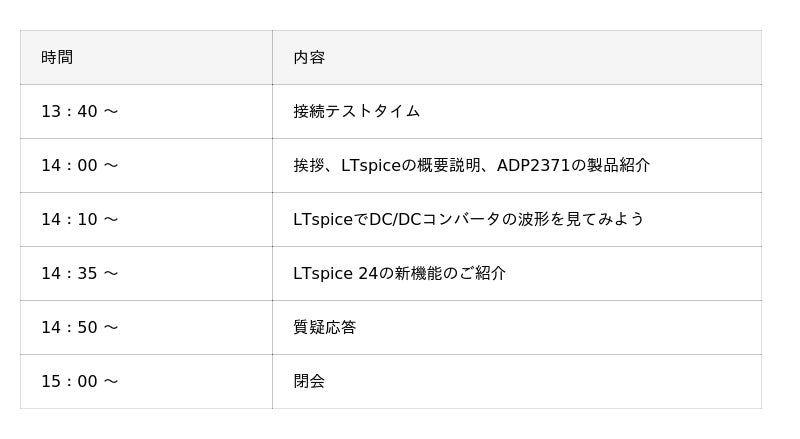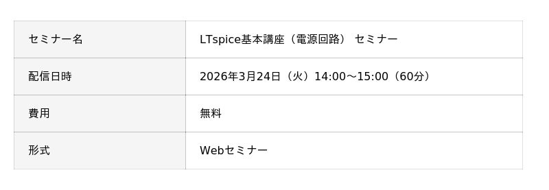 LTspiceをはじめて使用する方や新機能を知りたい方、電源回路のシミュレーションを検討している方を対象にLTspiceの基本操作と電源回路のシミュレーション方法の習得を目指します。