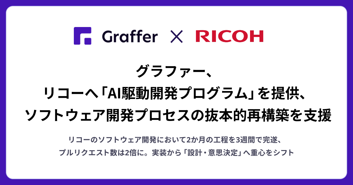 株式会社グラファー(本社:東京都渋谷区、代表取締役:石井大地、以下「当社」)は、株式会社リコー(本社:東京都大田区、代表取締役:大山 晃、以下「リコー」)に生成AIを前提とした次世代の開発体制を構築する「Graffer AI駆動開発プログラム」を提供したことをお知らせします。リコーでは本プログラムを通じて、2か月想定のクラウド移行を約3週間で完遂する事例や、プルリクエスト数が約2倍に増加する事例が生まれており、開発生産性の向上が確認されています。当社は、AI駆動開発の導入支援を通じて、企業のソフトウェア開発組織のポテンシャル最大化に貢献します。