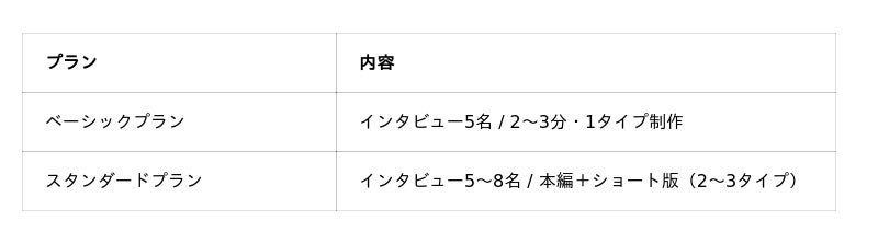 さらに、弊社クリエイティブディレクターが監修することで、通常のインタビュー動画撮影とは違い、伝えるための構成と編集品質を担保。社内共有用かPR用か、どの層に向けるかによって、動画の構成段階からご提案します。